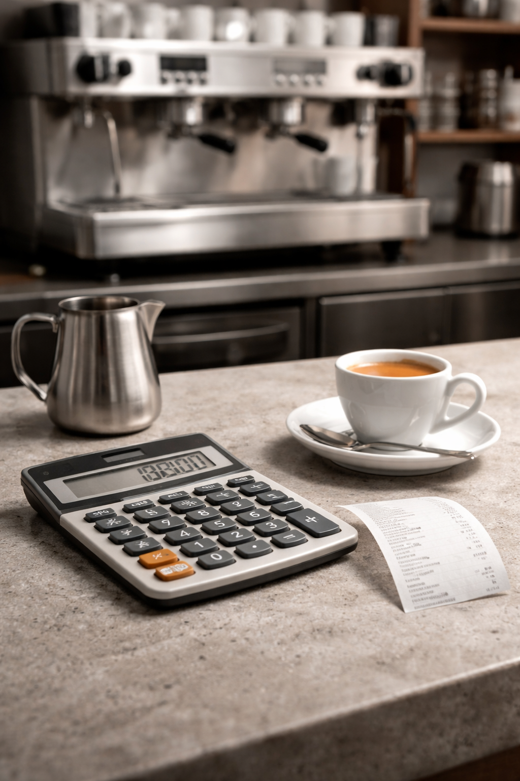 Kalkulator i paragon obok espresso, koszt i cena kawy w kawiarni na neutralnym blacie.